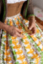 Mit handgeschnitzten Holzmodeln - die individuell angefertigt werden - wird der Stoff mit eigens gemischten Stofffarben bedruckt.